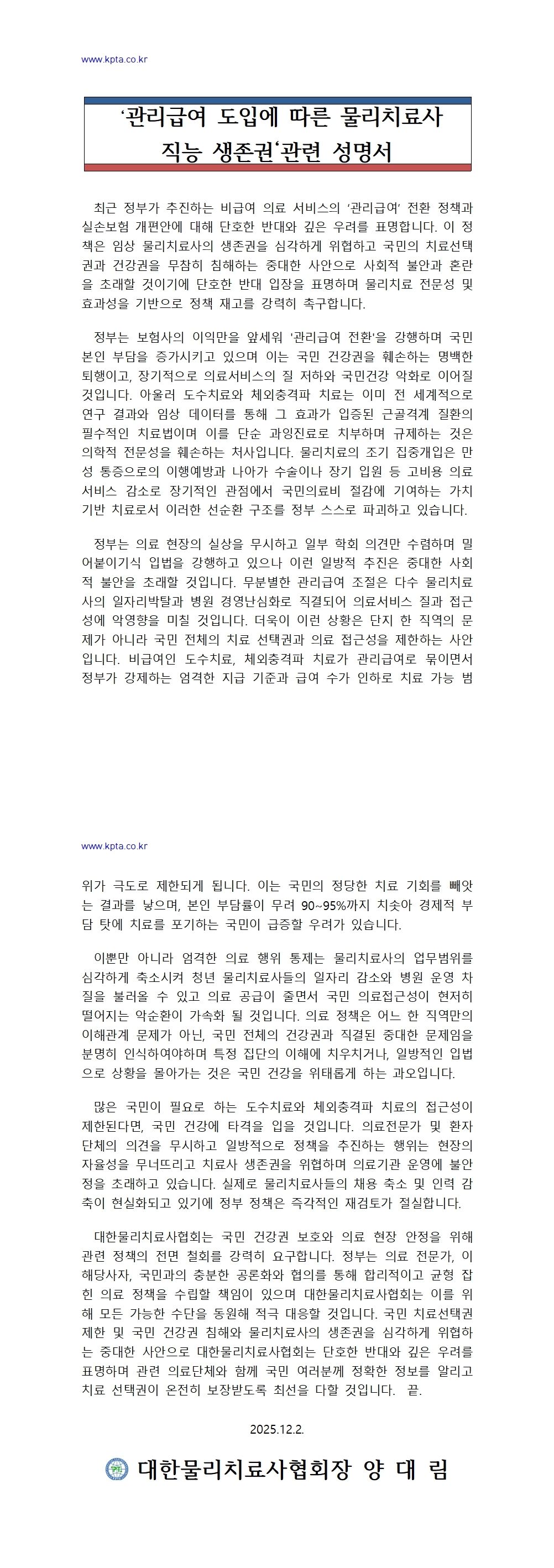 '관리급여 도입에 따른 물리치료사 직능 생존권' 관련 성명서